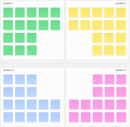 Every retrospective board is split into either columns or boxes. Each column or box represents a question that we would like to explore with the team. The questions may vary among the teams, but more or less, the meaning is the same. Some examples of questions: